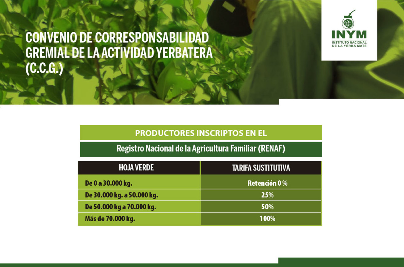 Tarifa Sustitutiva Hoja Verde equivalente a Yerba Mate Canchada: $94,77404 (por kg.)