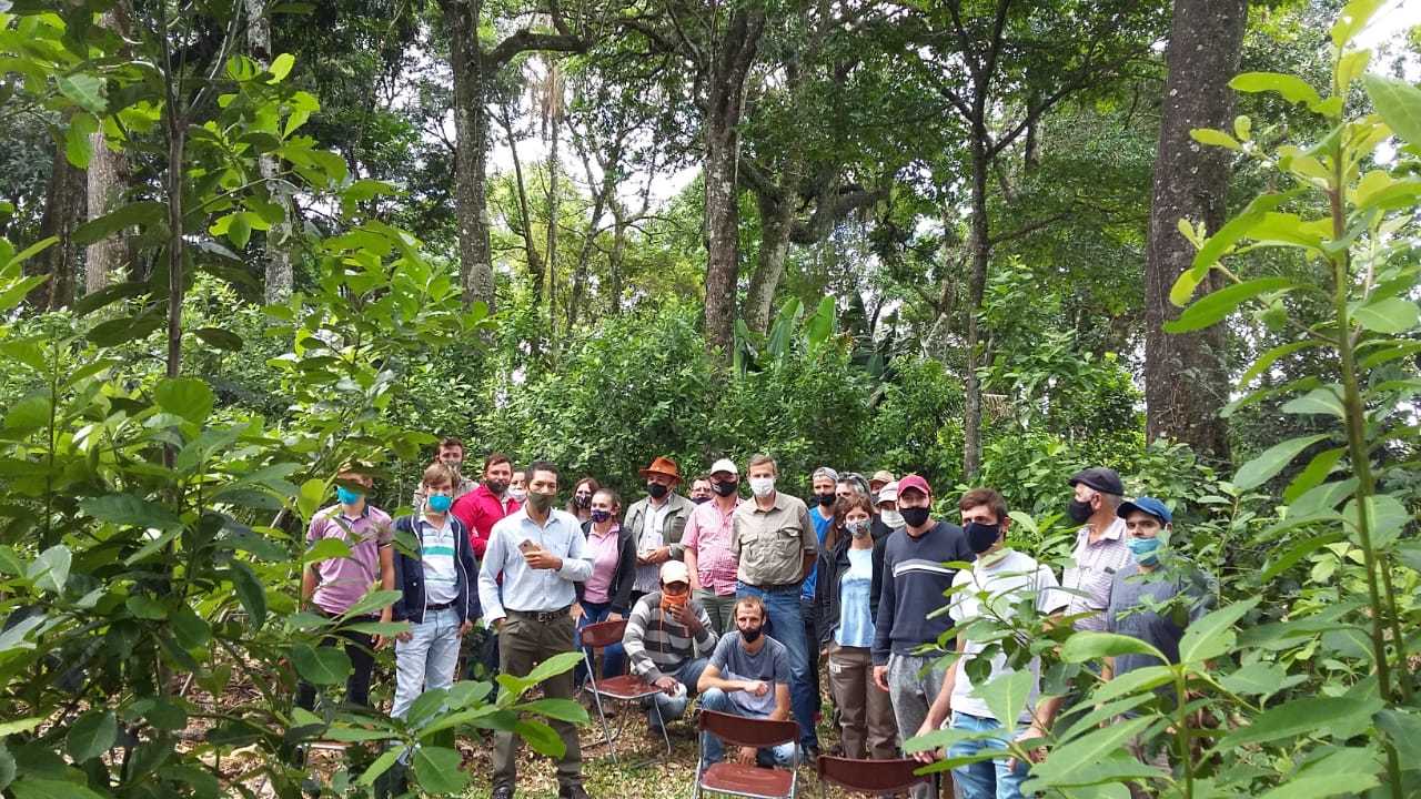 En el lugar, más de 20 productores yerbateros y técnicos compartieron el miércoles 18 de noviembre pasado conocimientos y experiencias junto al ingeniero agrónomo Guillermo Reutemann, experto e impulsor de este sistema de producción que combina yerba mate con otros árboles nativos en la misma superficie.