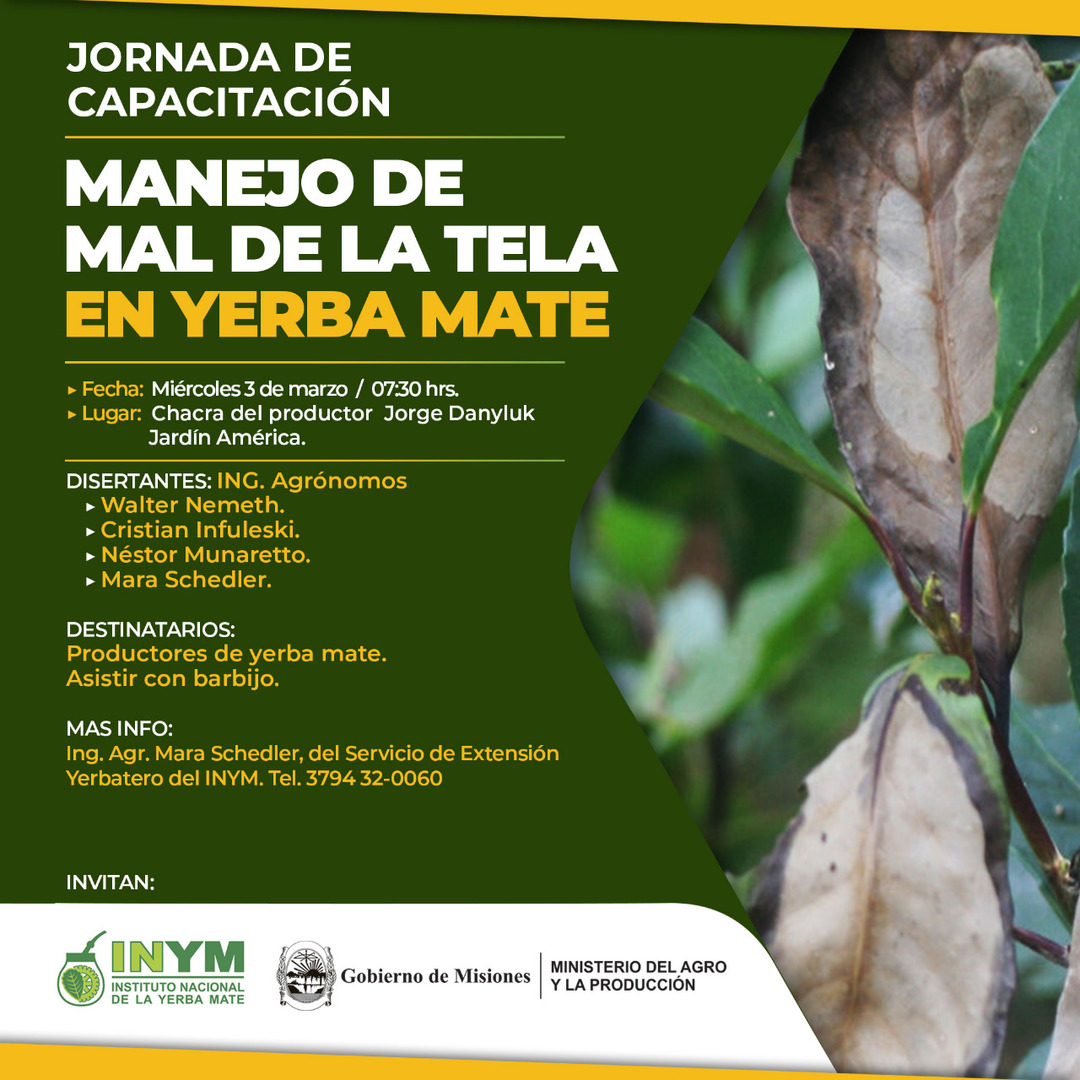 Destinado a todos los productores interesados, este miércoles (3 de marzo) el Servicio de Extensión Yerbatero del INYM y el Ministerio del Agro y la Producción de Misiones brindarán una charla sobre el Mal de la Tela en Jardín América. Será a las 7,30 en la chacra del productor Jorge Danyluk, con los ingenieros agrónomos Mara Schedler, Néstor Munaretto, Cristian Infuleski, y Walter Nemeth.
