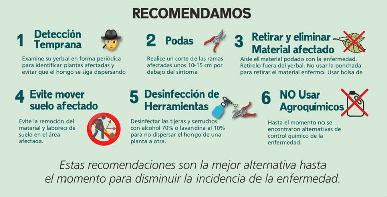 La prevención y detección temprana es la mejor herramienta para combatir esta enfermedad. Por eso se solicita a los productores que cuando detecten lotes que pueden estar afectados, informen a los técnicos del Servicio de Extensión Yerbatero, del Ministerio del Agro y la Producción, del INTA y del SENASA, solicitando su presencia en las chacras.