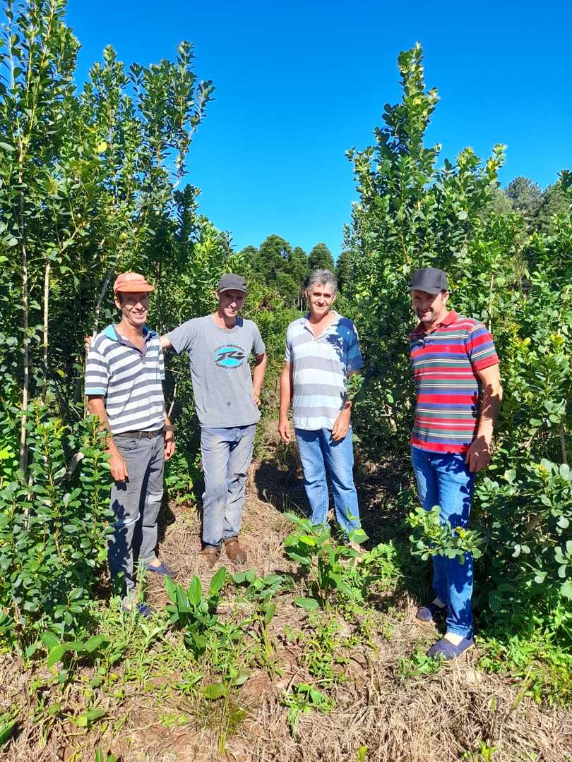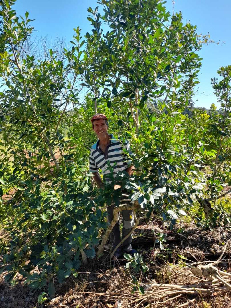 El productor Julio Goldhardt, de El Alcázar, muestra con satisfacción la buena reacción que tuvo el cultivo de yerba mate, con más hojas, tras la limpieza de plantas que se realizó en diciembre con motosierra, con el acompañamiento del ing. agr. Gustavo Baumgratz, del Servicio de Extensión Yerbatero del INYM.