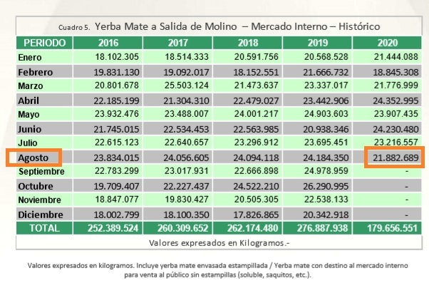 Las declaraciones juradas referidas a la “salida de molino” durante el mes de agosto de este año alcanzan los 21,8 millones de kilos, totalizando 179,6 millones de kilos para el periodo enero – agosto.