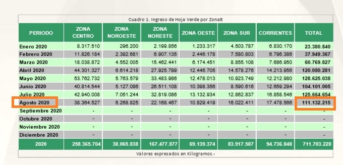 Respecto a la cosecha, las declaraciones juradas indican que en el mes de agosto ingresaron a secaderos 111, 13 millones de kilos de hoja verde, totalizando un volumen de 711, 7 millones de kilos para el periodo enero – agosto.