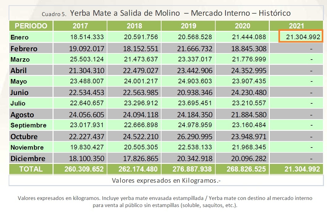 Los datos estadísticos generados por el INYM a partir de las declaraciones juradas de la “salida de molino” indican que en el mes de enero del corriente año el consumo interno de yerba mate elaborada fue de 21, 3 millones de kilos.