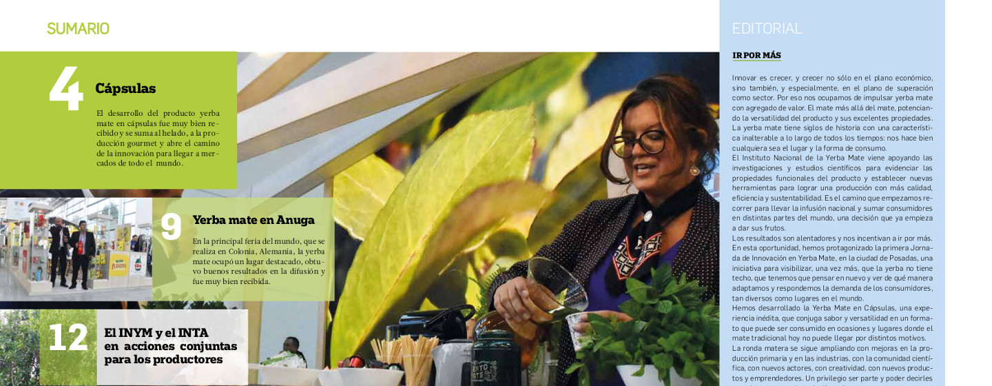 - Yerba mate en Anuga: En la principal feria del mundo, que se realiza en colonia Alemania, la Yerba Mate ocupó un lugar destacado, obtuvo buenos resultados en la difusión y fue muy bien recibida