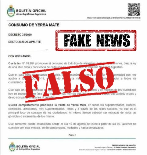 Informamos que es totalmente falsa una publicación que circula en redes sociales y que, valiéndose del logo del Boletín Oficial, intenta instalar la idea de una supuesta prohibición de la venta de yerba mate.