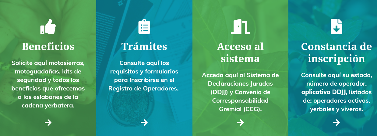 Bien a mano los usuarios pueden encontrar : el acceso a los beneficios que ofrecemos a todos los eslabones del sector, trámites, acceso al Sistema de Declaraciones Juradas (DDJJ) y Convenio de Corresponsabilidad Gremial (CCG) y Constancia de inscripción donde los operadores pueden consultar su estado, número de operador, aplicativo DDJJ, listados de: operadores activos, yerbales y viveros.