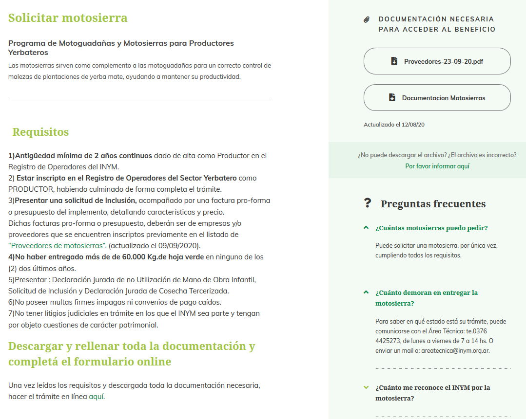 Tanto en beneficios (donde se pueden solicitar motoguadañas, motosierras, etc) como en trámites, pueden consultarse las preguntás más frecuentes que hicieron otros usuarios.