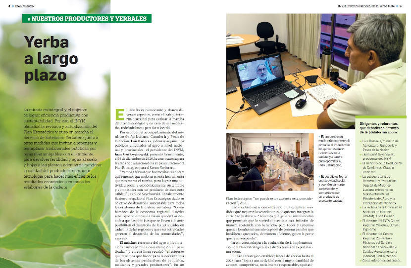 - NUESTROS PRODUCTORES Y YERBALES: El INYM oficializó la revisión y actualización del Plan Estratégico y presentó el Servicio de Extensión Yerbatero, junto a otras medidas que invitan a repensar y reemplazar tradicionales prácticas por otras más amigables con el ambiente.