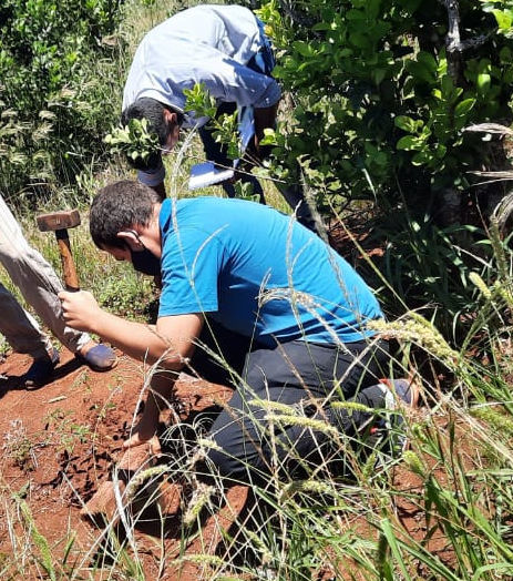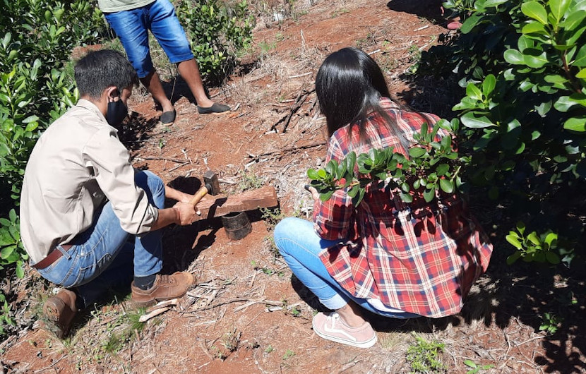 Organizados en pequeños grupos para evitar la propagación del Covid, los estudiantes asisten a las jornadas a campo donde los ingenieros agrónomos Damián Rivero y Daniel Fernández intercambian conocimientos con los productores de yerba mate.