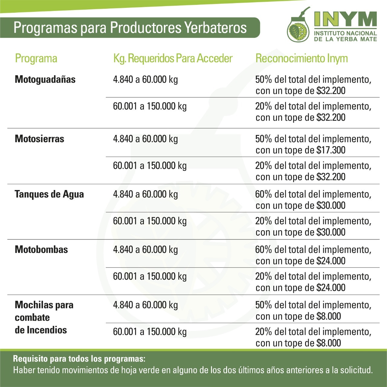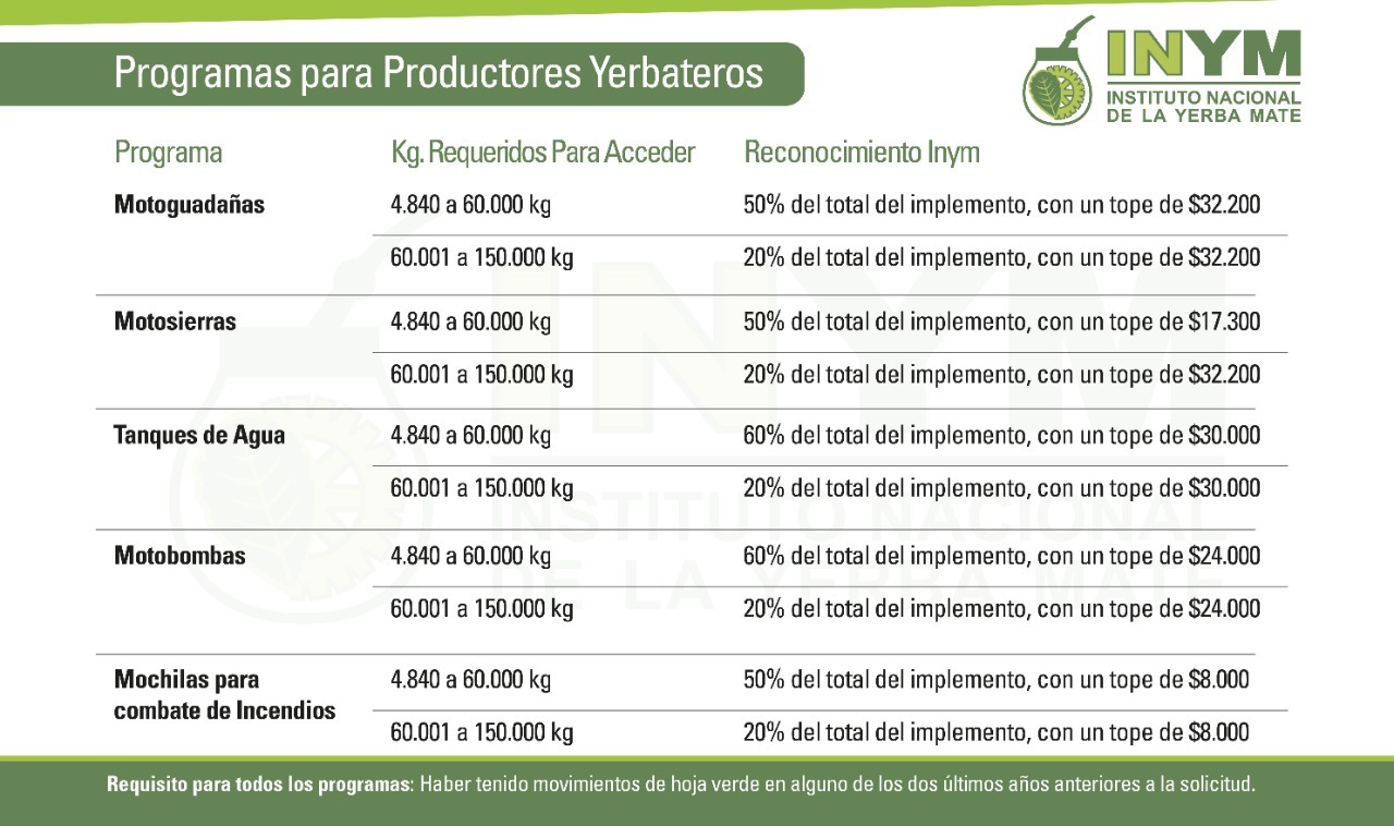 El INYM lleva adelante una serie de programas de apoyo a todo el sector yerbatero; entre los cuales se encuentran aquellos destinados a proveer de herramientas y equipamiento a los productores.