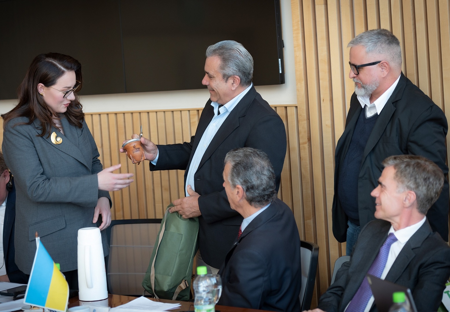 La delegación gubernamental de Ucrania estuvo encabezada por la Sra. Yuliia Svyrydenko, Primera Vice-Primer Ministra – Ministra de Economía de Ucrania, acompañada por el Sr. Oleksandr Kamyshin, Ministro de Industrias Estratégicas de Ucrania, el Sr. Oleksii Sobolev, Viceministro de Economía para el Desarrollo Digital, Transformaciones Digitales y Digitalización y el Sr. Serhii Boiev, Viceministro de Industrias Estratégicas para la Integración Europea, entre otras autoridades ucranianas.