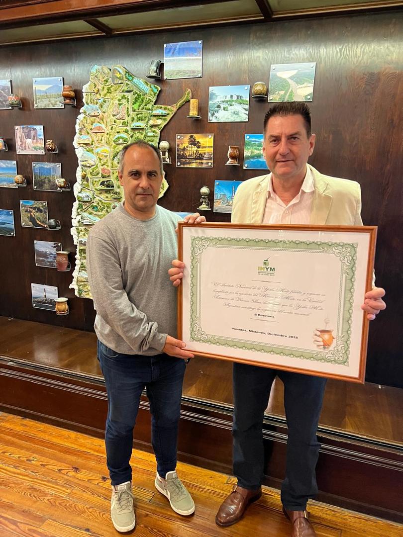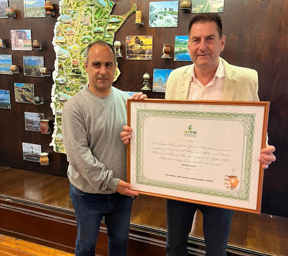 El reconocimiento es una placa con las siguientes líneas: “El Instituto Nacional de la Yerba Mate felicita y expresa su beneplácito por la apertura del Museo del Mate en la Ciudad de Buenos Aires, destacando que la Yerba Mate Argentina constituye la expresión del sentir nacional”. Lleva la firma: Directorio, con fecha Diciembre de 2025.