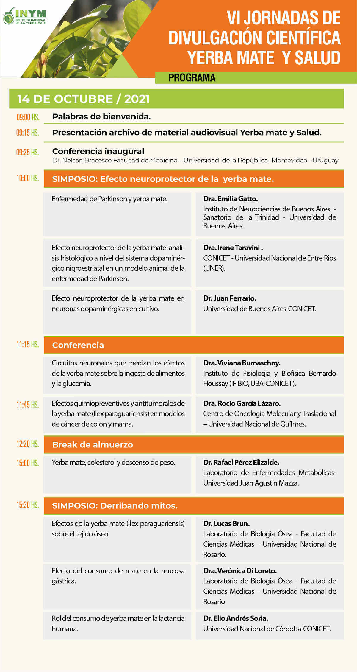 Luego disertarán, como parte del Simposio “Efecto neuroprotector de la yerba mate”, la Dra. Emilia Gatto, del Instituto de Neurociencias de Buenos Aires, Universidad de Buenos Aires , sobre “Enfermedad de Parkinson y yerba mate”; la Dra. Irene Taravini, de la Universidad Nacional de Entre Ríos – CONICET, sobre “Efecto neuroprotector de la yerba mate: análisis histológico a nivel del sistema dopaminérgico nigroestriatal en un modelo animal de la enfermedad de Parkinson”, y el Dr. Juan Ferrario, de la Universidad de Buenos Aires – CONICET, sobre “Efecto neuroprotector de la yerba mate en neuronas dopaminérgicas en cultivo”.