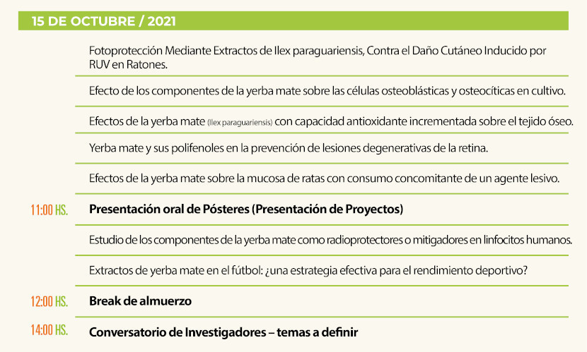 A las 15.30, el simposio “Derribando mitos” tendrá cómo primer expositor al Dr. Lucas Brun, del Laboratorio de Biología Ósea - Facultad de Ciencias Médicas, Universidad Nacional de Rosario, con “Efectos de la yerba mate (Ilex paraguariensis) sobre el tejido óseo”; luego será el turno de la Dra. Verónica Di Loreto, del Laboratorio de Biología Ósea - Facultad de Ciencias Médicas, Universidad Nacional de Rosario, con “Efecto del consumo de mate en la mucosa gástrica”, y del Dr. Elio Andrés Soria, de la Universidad Nacional de Córdoba-CONICET, con “Rol del consumo de yerba mate en la lactancia humana”.