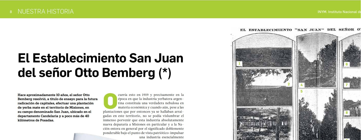 Hace aproximadamente diez años, el señor Otto Bemberg resolvió, a titulo de ensayo para la futura radiación de capitales, efectuar una plantación de yerba mate en el territorio de Misiones, en su campo denominado San Juan, ubicado en el departamento Candelaria y a poco más de cuarenta kilómetros de Posadas.