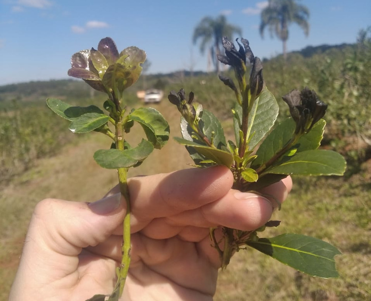 “Los efectos negativos de las bajas temperaturas fueron observados en distintas chacras de Dos de Mayo a mediados de agosto, donde la brotación de plantas de yerba mate bajo sombra de árboles nativos no presentó daños por heladas, lo cual se evidencia por la ausencia de brotes apicales quemados- necrosados, mientras que las áreas de cultivo en las mismas chacras, pero a cielo directo, si evidenciaban dichos daños”, indicó Schedler.