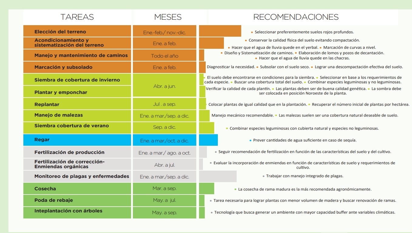 En el siguiente gráfico, la información base - las tareas, mes y recomendaciones- desde la elección del terreno para el nuevo yerbal hasta la cosecha, incluyendo temas como manejo y mantenimiento de caminos para que el agua de lluvia quede en la chacra, monitoreo de plagas, cobertura en distintas estaciones del año, incorporación de árboles nativos, y otras acciones.