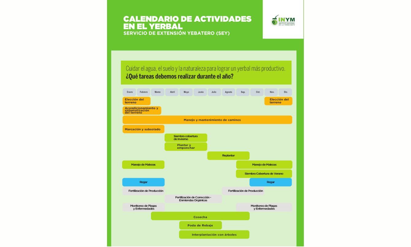 La conocida frase ilustra cabalmente el “Calendario de actividad en el yerbal” que el Servicio de Extensión Yerbatero del INYM ofrece en esta publicación con el objetivo de acercar información sobre las distintas tareas y en qué mes del año deben realizarse, de cara a lograr un yerbal productivo y sustentable.