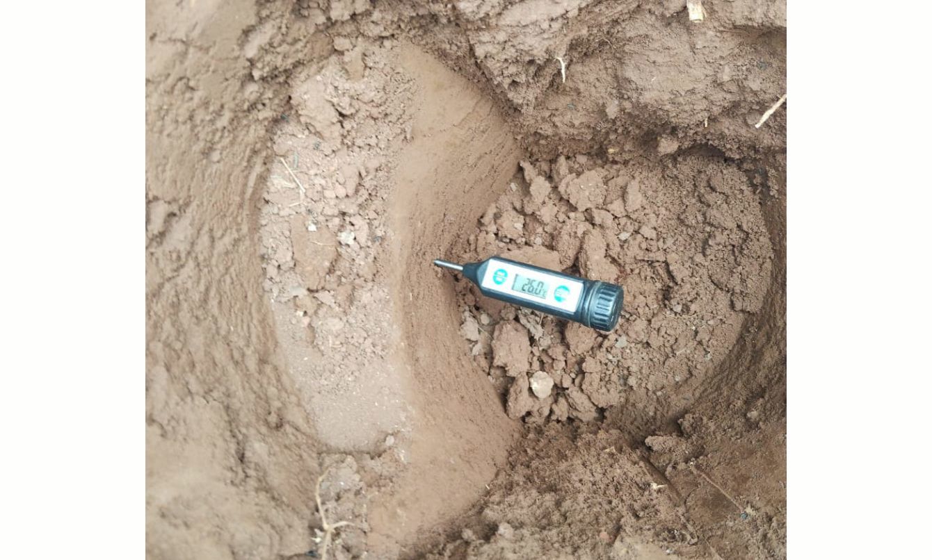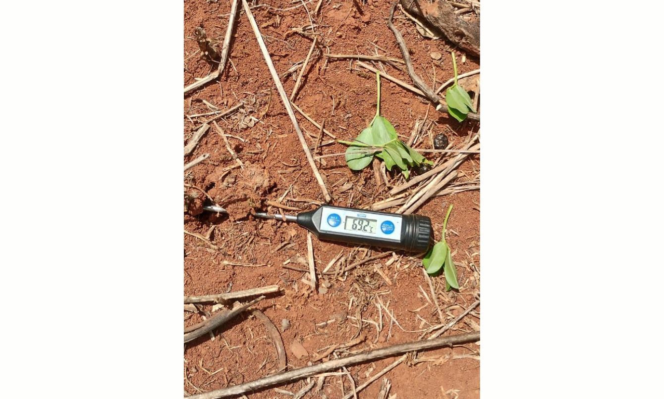 “Se realizaron mediciones en las horas de mayor incidencia de radiación, midiendo hasta 42°C en la temperatura del aire a pleno sol, y seguidamente se midieron las temperaturas de suelo en los dos manejos a diferentes profundidades: a nivel superficial del suelo, en el manejo tradicional se detectaron temperaturas de 58,9°C a 69,2 °C, y en el manejo con maní forrajero las temperaturas estuvieron entre 29,2°C y 30,4°C “, detalló el técnico del INYM.
