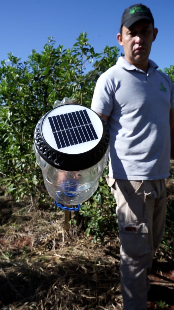 La trampa consiste en “una lámpara que es alimentada con un panel solar, colocada en una estructura que es un bidón de 5 litros (agua mineral), al que se le pone agua con detergente en el fondo y se le hace agujeros en los costados. Los insectos, atraídos por la luz, ingresan y caen al agua, y eso nos permite identificarlos”, explicó.