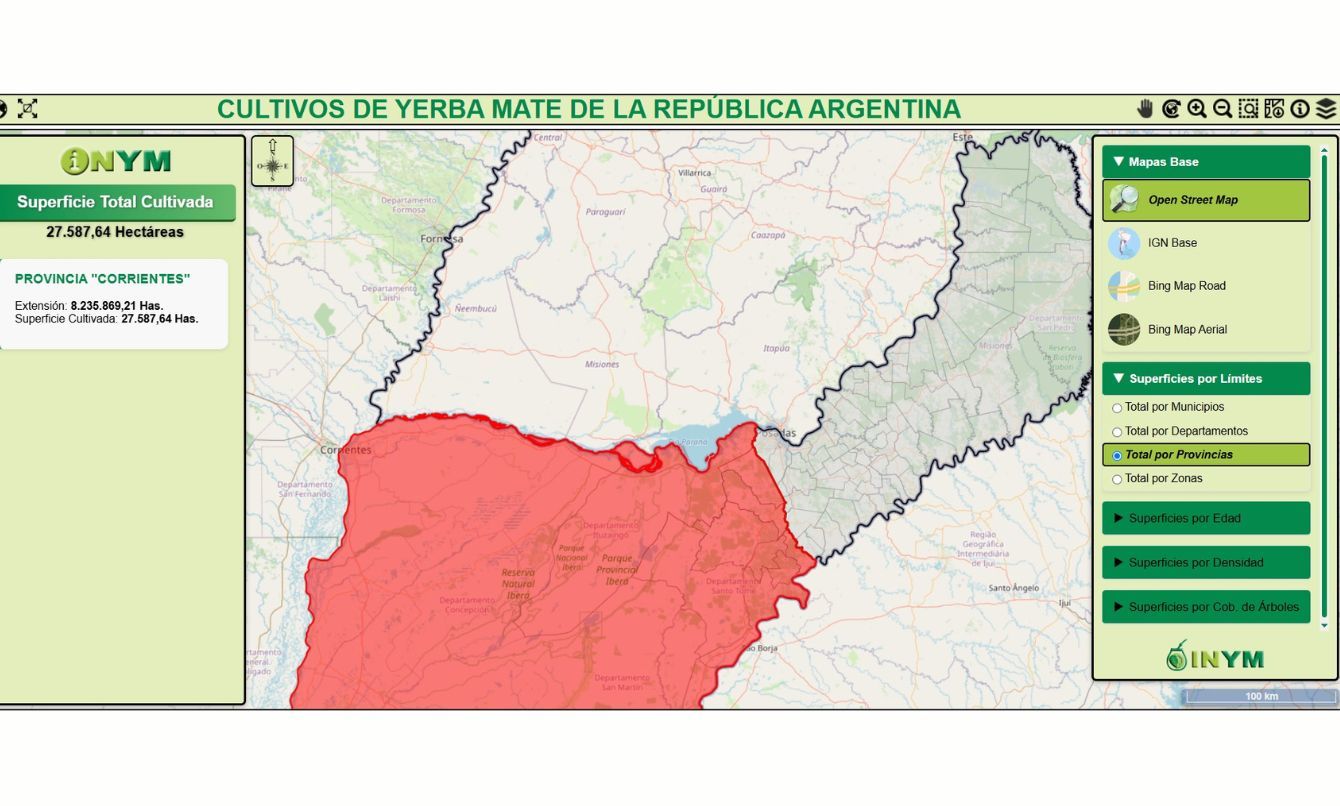 El mapa interactivo, denominado Cultivos de Yerba Mate de la República Argentina, permite visualizar, por zona productora, por Provincia productora (Misiones y Corrientes), por Departamento y por Municipio, la superficie, edad y densidad de las plantaciones, además de la cobertura arbórea nativa y/o forestación existente en los yerbales.
