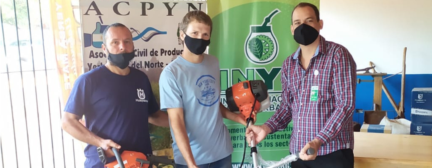 Motosierras, motoguadañas, indumentaria y kits sanitarios fueron entregados hoy (25 de septiembre) a productores de Andresito por el director de la Producción en el Instituto, Jonás Petterson, integrantes del Area Técnica del Instituto y el presidente de la Asociación Civil de Productores Yerbateros del Norte, Julio Petterson .