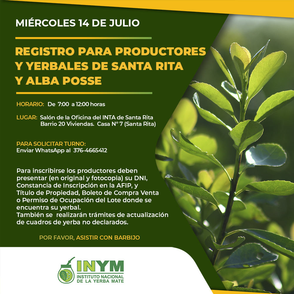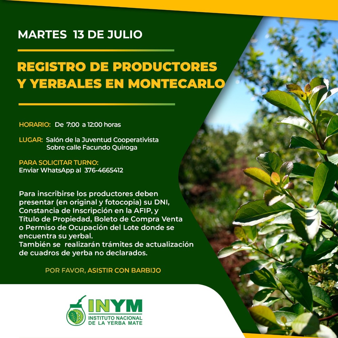 El área de Registros del Instituto Nacional de la Yerba Mate estará en Montecarlo el martes 13 de julio y el miércoles 14 en la localidad de Santa Rita, a los efectos de realizar la inscripción de productores y yerbales, como así también efectuar los trámites de actualización de aquellos cuadros de yerba mate que aún no fueron declarados.