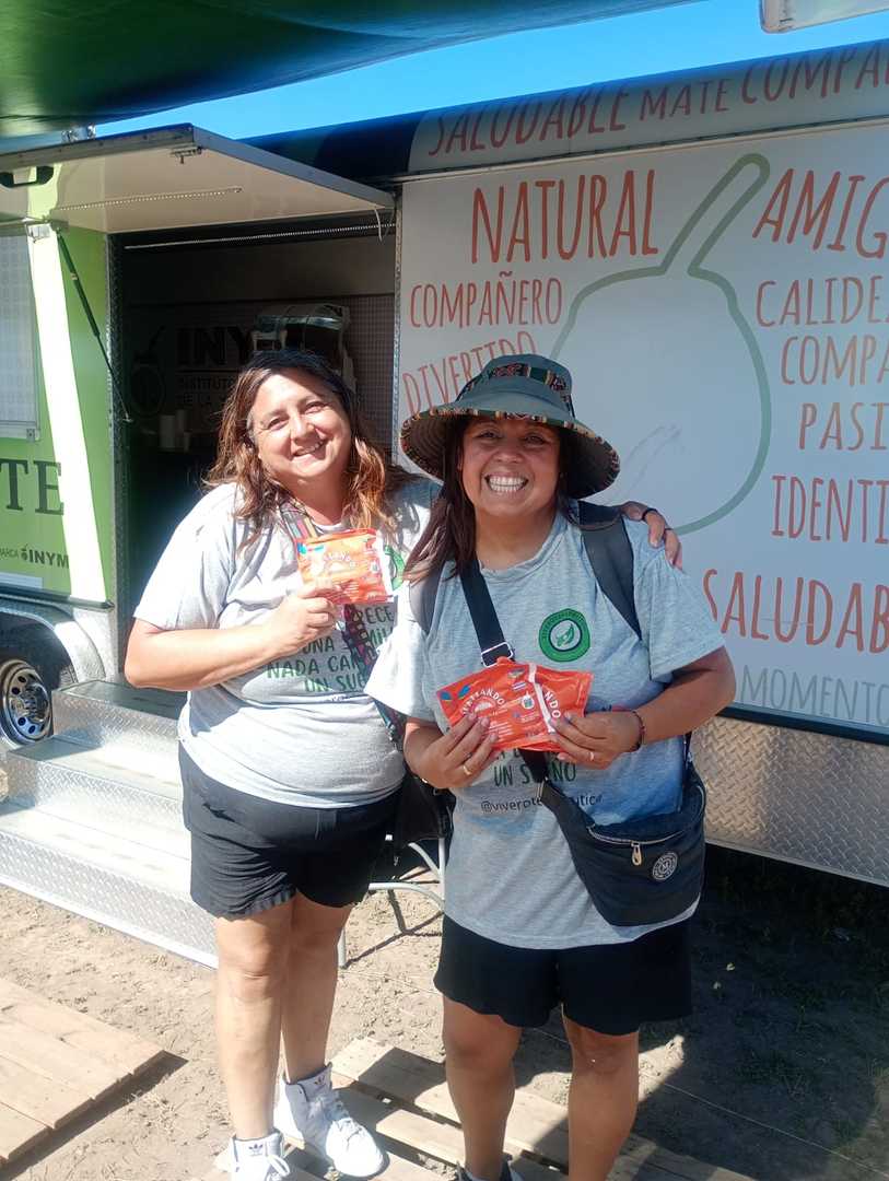 En el trailer del INYM también se ofreció degustación de mate cocido tradicional, mate cocido tipo “frozen”, recarga de mates, reposición de agua caliente y para los materos que recorrían el predio. Además, se entregaron muestras de yerba mate de las empresas y cooperativas que acompañaron la iniciativa.